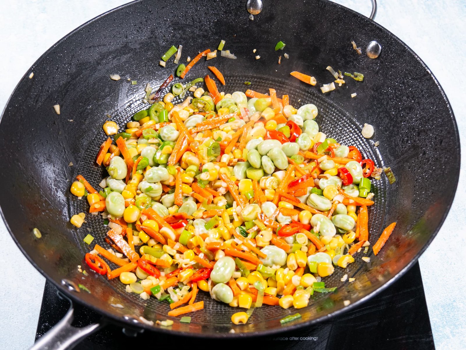 - Add another tablespoon of oil to the wok and toss in the julienned carrots. Stir-fry for 15 seconds before adding the green onions, garlic, chili pepper (if using), baby broad beans, and sweet corn. Stir-fry everything over high heat for 1–2 minutes, allowing the vegetables to retain a slight crunch. Push the vegetables to the edges of the wok to make room for the eggs.