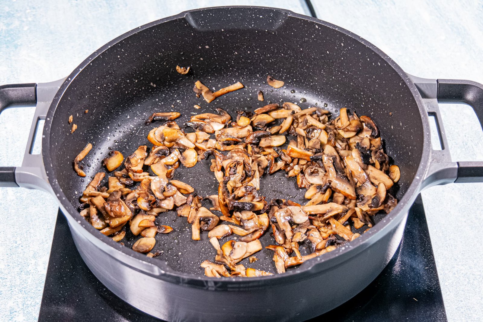 - Heat 3 tablespoons of olive oil in a skillet over medium heat. Add the mushrooms and sauté for 5–6 minutes until golden brown. Remove from the skillet and set aside.
