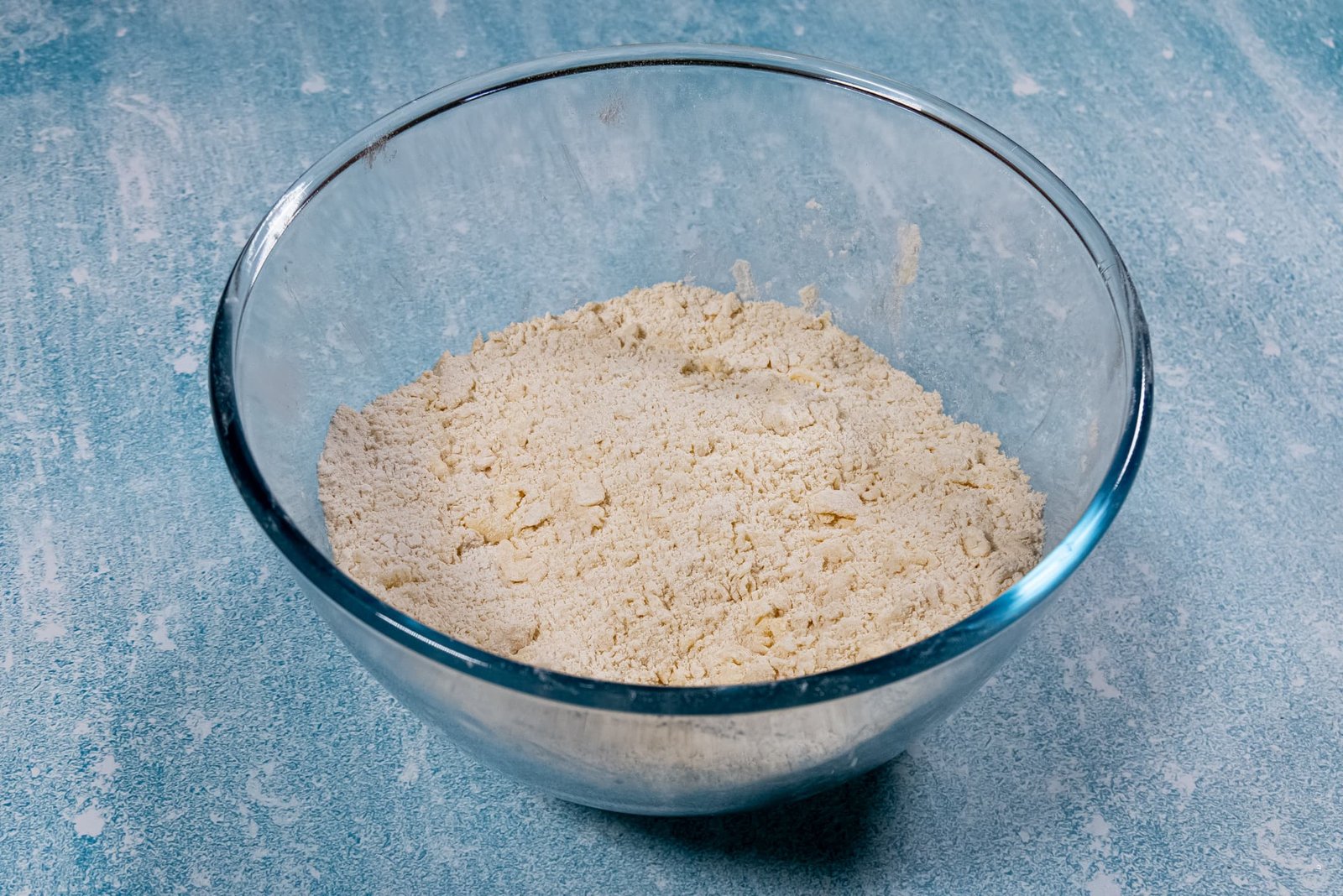 - Add the diced cold butter and mix with your fingers (or pulse in the processor) until the mixture resembles coarse crumbs.