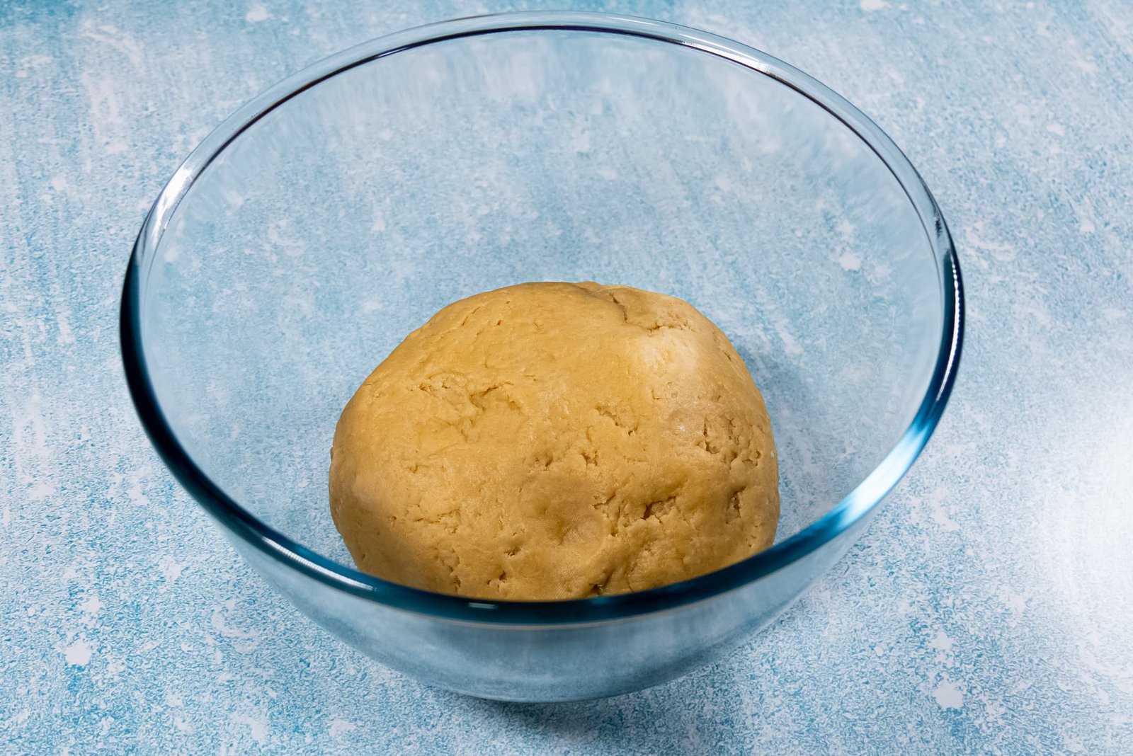 - Beat the eggs lightly and add them to the mixture. Gradually add ice-cold water, 1 tablespoon at a time, until the dough comes together and forms a smooth, non-sticky ball.