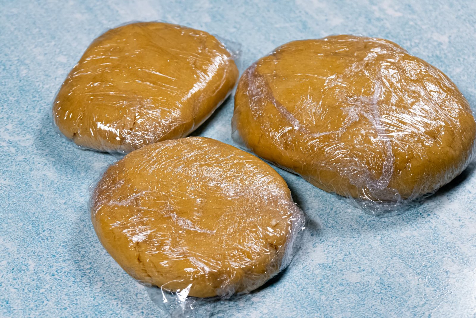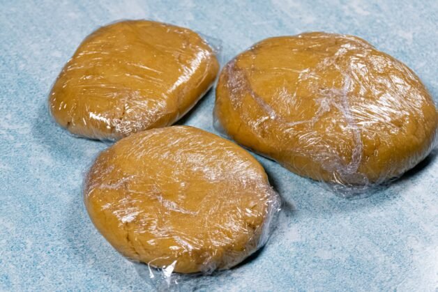 - Divide the dough into three parts: one larger portion (½ of the total dough) for the base and two smaller portions (¼ each) for the top crust and decorative elements. Shape each portion into a ball, wrap it in plastic wrap, and refrigerate for 20–30 minutes.