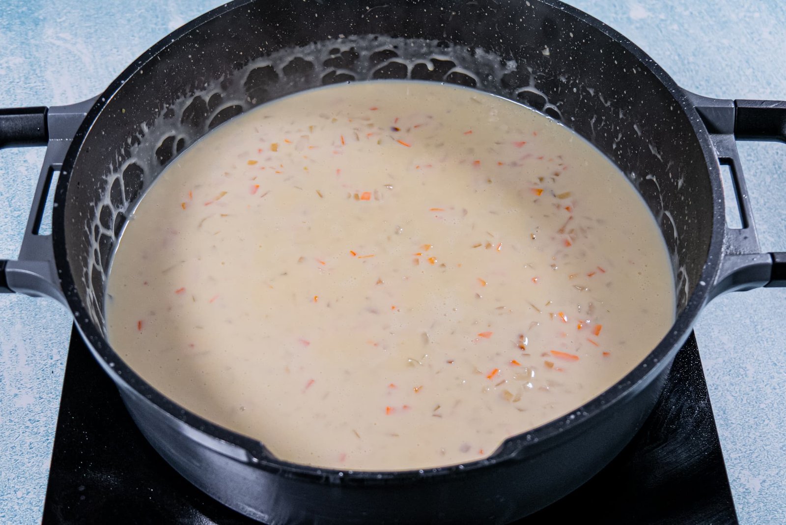 - Gradually pour in 1 ¼ cups (300 ml) of chicken broth and ⅔ cup (150 ml) of heavy cream, whisking to prevent lumps. Cook for 5 minutes until the mixture thickens.