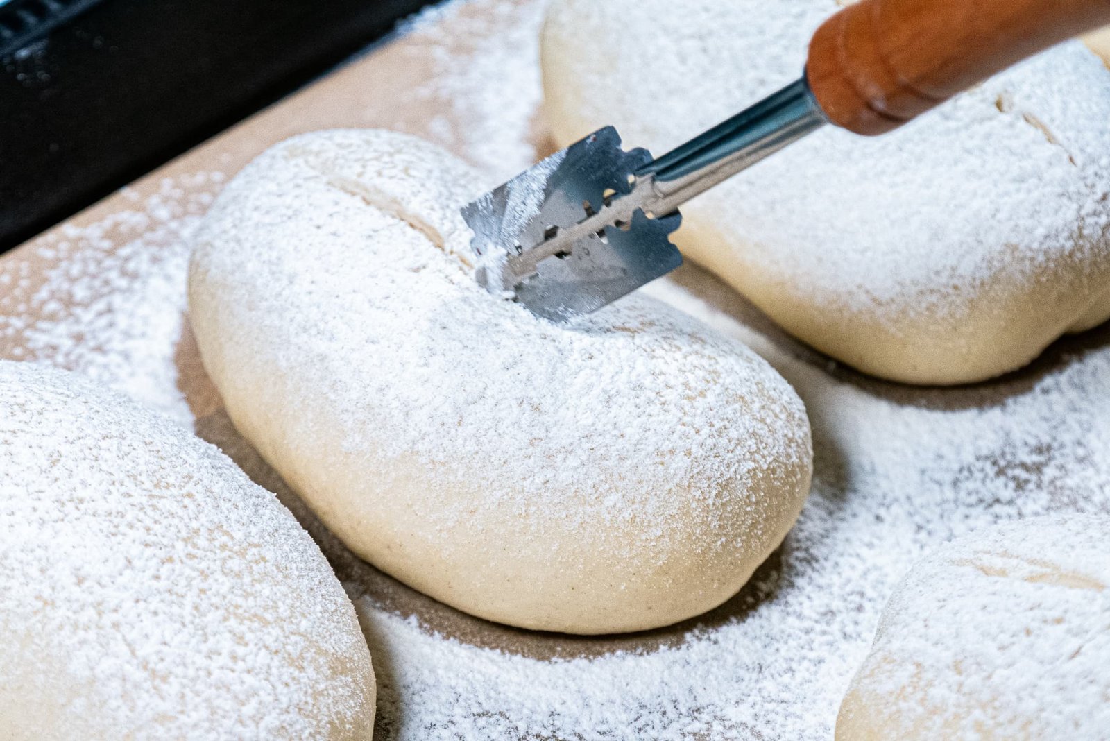 - Preheat your oven to 350°F (180°C). Lightly dust the buns with flour and score the tops with a sharp knife or razor blade for a decorative finish.