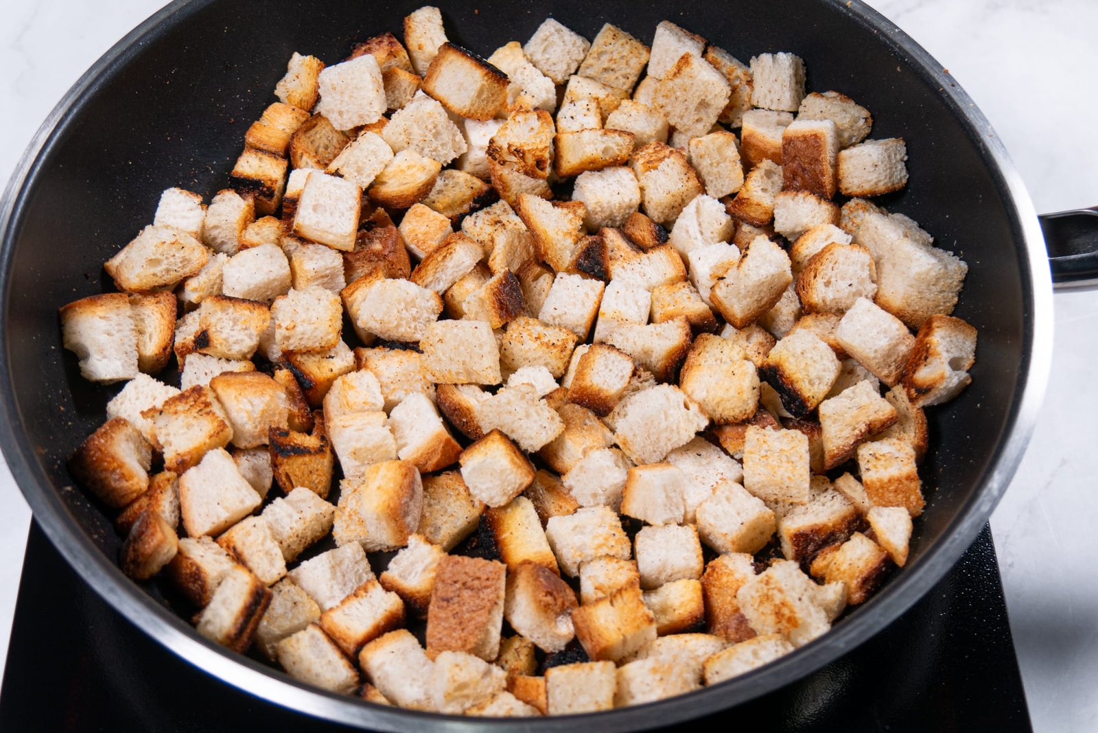 - Toast the bread cubes in a skillet with a drizzle of olive oil until golden and crispy. Set aside to cool.