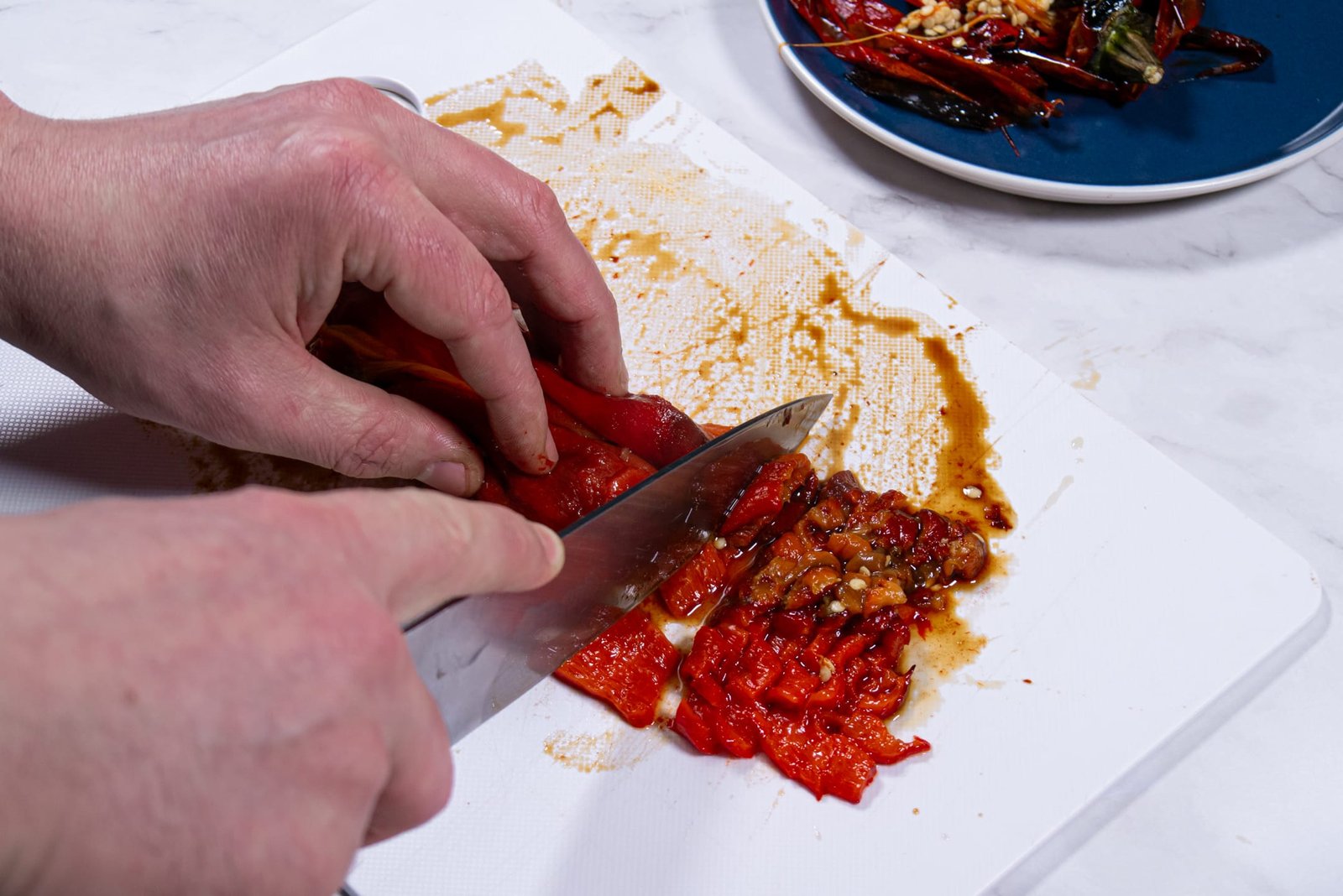 - If not using pre-roasted peppers, roast them over an open flame or in the oven at 450°F (230°C) until the skin is blackened. Place them in a covered bowl to steam, then peel off the skin, remove the seeds, and slice into strips.