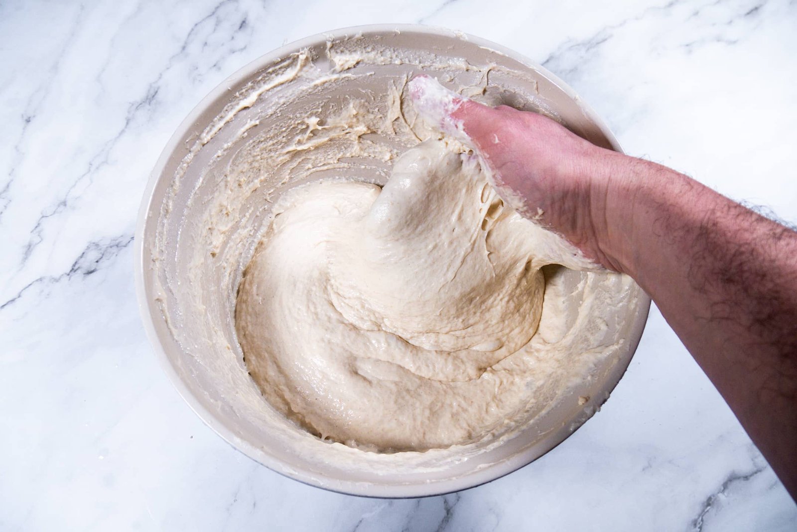 - Combine the remaining flour and salt in a large bowl. Add the activated yeast mixture, the remaining 500 ml of lukewarm water, and 50 ml of oil. Mix until a sticky dough forms. Knead the dough by hand or with a mixer fitted with a dough hook for 8-10 minutes, until smooth and elastic. The dough will remain sticky but should hold its shape.